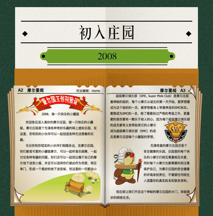 在这一年,,摩尔庄园诞生了。。。在这里,,,,大家都是可爱的红鼻子鼹鼠小摩尔,,可以一起勤劳耕作,,,,一起高山滑雪......我们都是摩尔庄园的建设者。。