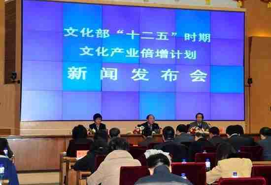 2月28日下午,,,文化部在京召开新闻发布会,,,,正式向社会发布《文化部“十二五”时期文化产业倍增计划》,,,提出了 “十二五”期间文化部门管理的文化产业增加值年平均现价增长速度高于20%,,,2015年比2010年至少翻一番,,,实现倍增的奋斗目标。。